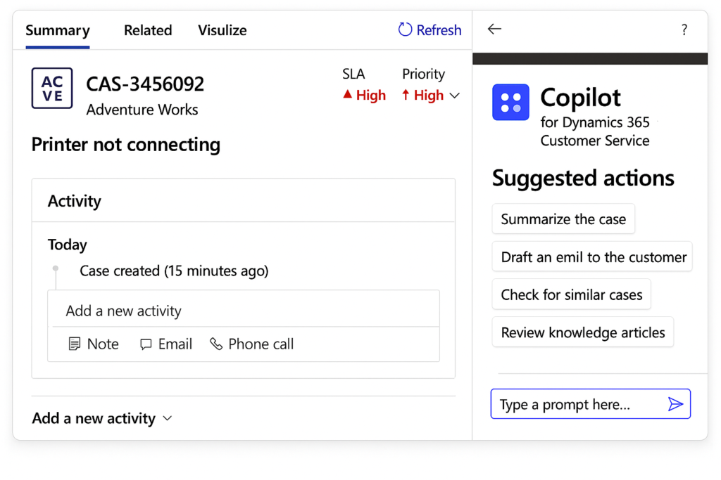 Chat de conocimientos, redacción de emails, resúmenes de casos y análisis de Copilot. Algunas requieren configuración adicional.